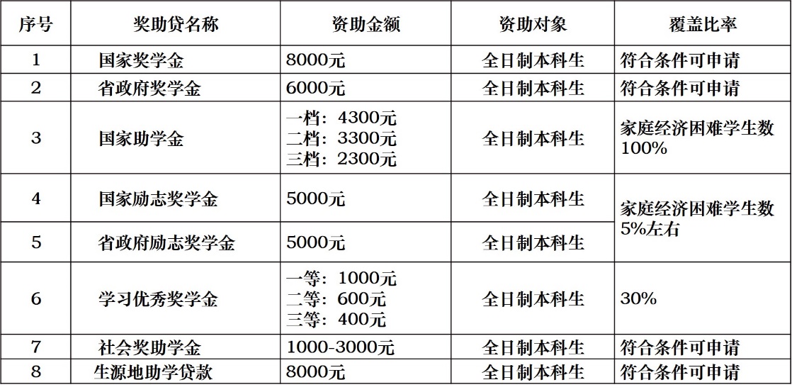 设有国家奖助学金、国家助学贷款、校长奖学金、勤工助学、特殊困难补助、建档立卡学费减免、新生入学“绿色通道”等多种方式的混合奖助育人体系。