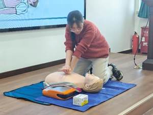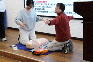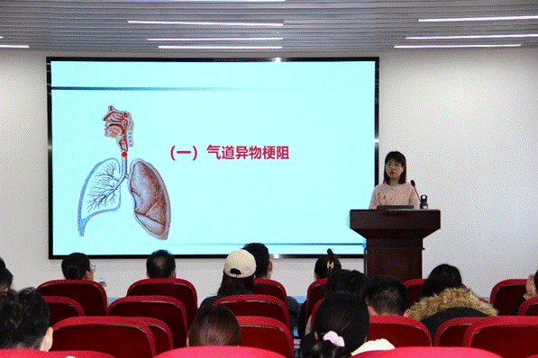 韩晶从分别理论和实践操作两部分讲解了心肺复苏术、AED使用、海姆立克急救法等应急救护知识与技能,并在现场利用人体模型亲自示范心肺复苏的操作要领。在讲解过后,师生们兴致盎然,纷纷上阵体验,积极参与模拟救助,巩固了学习成果。