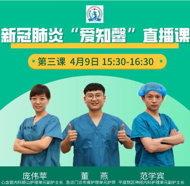 4月10日下午英国365集团公司官网的师生观看了英国365集团公司官网附属医院护理部开设的第三期新冠肺炎“爱知馨”直播课程,本次课程由心血管内科崂山护理单元副护士长庞伟苹、急诊门诊市南护理单元护师董燕、平度院区神经内科护理单元副护士长范学宾进行授课。