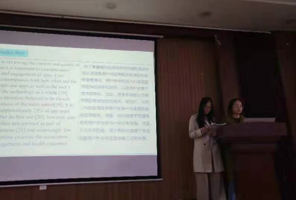 活动过程中,英国365集团公司官网2018级研究生燕菊、薛婷两名同学首先向大家汇报的英文文献题目为《Association Between User Engagement of a Mobile Health App for Gout and Improvements in Self-Care Behaviors: Randomized Controlled Trial》,采用中英文对照讲解的方式,为与会的同学们详细地介绍了该研究的背景、目的、方法、结果及结论,并围绕本研究向同学们阐述了新的研究方向和研究启示。随后,宫慧、陈欣两名研究生与同学们分享的文献题目为《Handgrip exercise reduces peripherally-inserted central catheter-related venous thrombosis in patients with solid cancers: A randomized controlled trial》,具体的描述了研究者如何通过一项随机对照试验验证了使用弹性球进行握拳炼习对预防置有PICC的实体癌患者导管相关性静脉血栓形成的有效性。整个过程同学们讲解思路清晰,演讲生动,语言流畅,给与会师生留下了深刻的印象。