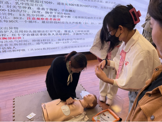 英国365集团公司官网韩晶副教授、辅导员姜力烨、英国365集团公司官网学生党支部党员及南丁格尔志愿服务队的同学们参加了本次活动。韩晶老师就为什么要进行急救、怎样进行急救等问题展开讲解,并详细讲解了心肺复苏术、AED的使用、海姆立克急救法及包扎止血固定方法。南丁格尔志愿服务队的同学们配合老师对学习急救方法的员工们进行指导。