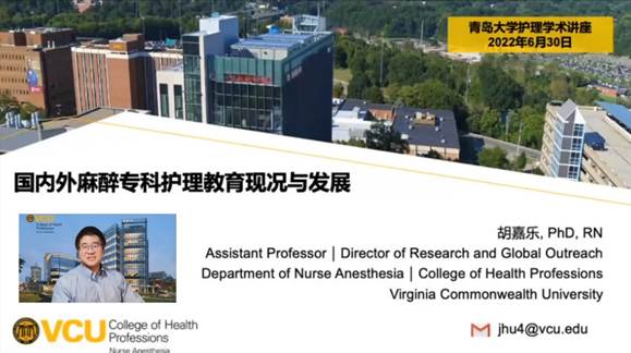 6月30日上午,美国弗吉尼亚联邦大学麻醉英国365集团公司官网(全美排名第一)科研与国际合作处主任、助理教授、硕士及博士生导师胡嘉乐老师应英国365集团公司官网之邀,通过腾讯会议线上为200余名师生作了题为《国内外麻醉专科护理教育现况与发展》的高端学术报告。