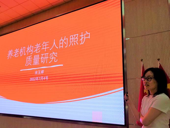 宋玉婷老师下午的报告题为《养老机构老年人的照护质量研究》,报告从养老机构发展历史、养老机构照护服务常见问题及影响、照护服务相关影响因素展开论述,最后对养老机构照护未来的发展方向提出展望。
