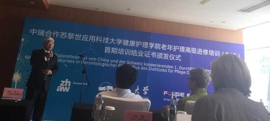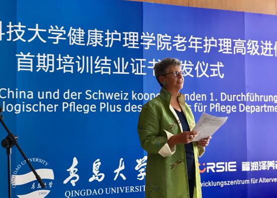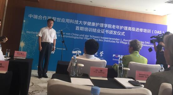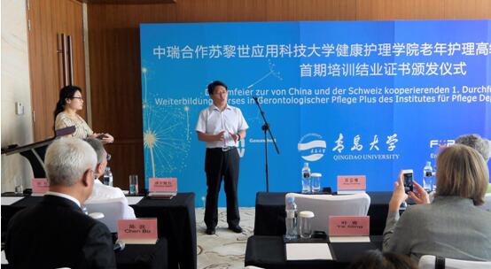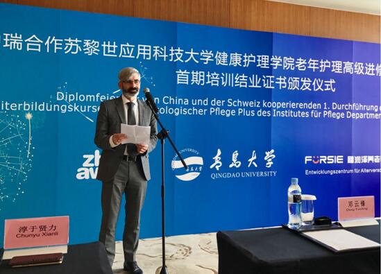 青岛市委常委、教育局局长邓云锋首先致辞,他对于英国365集团公司官网、瑞士苏黎世科技应用大学健康英国365集团公司官网和青岛福润泽养老事业发展中心开展的三方合作给予了充分肯定,表示首期中瑞养老护理高级进修培训取得圆满成功,对于应对人口老龄化的到来意义深远。