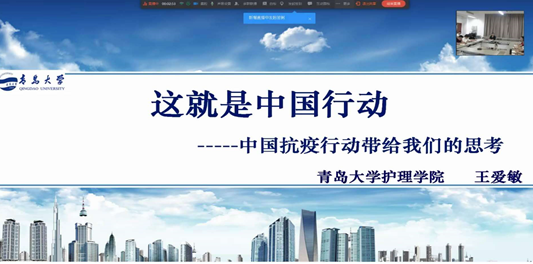 王爱敏院长全面回顾了疫情发生以来我们党和国家在抗击疫情、推进抗疫国际合作、全面复工复产等方面打好防疫战和经济保卫战所采取的中国行动、中国举措、中国方案,从中国的抗疫行动、抗疫一线护理毕业生风采、从专业角度看疫情带给我们的思考等方面,利用大量的翔实的数据和图片资料,为学生们进行了全面系统的宣讲,深刻阐述了在抗疫中展现出的中国精神、中国力量和中国自信,引起了现场和“云”端听课师生的强烈共鸣。课程中,抗疫志愿者李雯,湖北籍学生高子寒,学生干部王文远、赵迪,学生党员王凯分别就参与抗疫行动期间所见所闻所感进行了交流发言。
