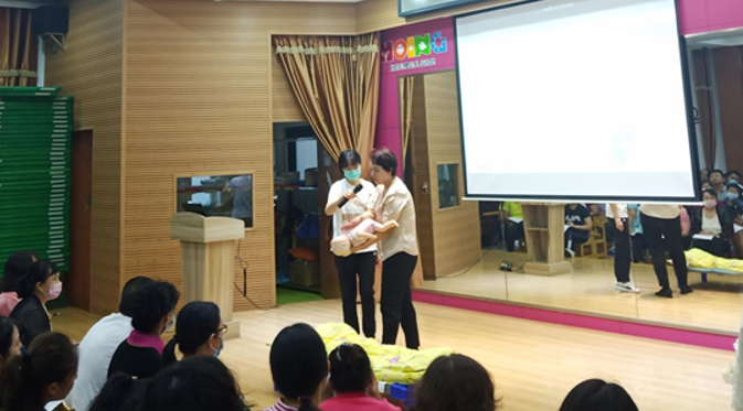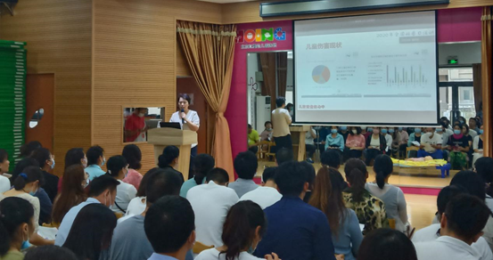 活动中,杨秀玲老师首先通过PPT以分析、举例、图示等各种方式详细生动的向老师及家长们讲解了儿童伤害现状,阐述了对于儿童安全工作的重要性。其次,在面对溺水、窒息等重大危险,幼儿教师及家长可以采取何种预防措施,将危险遏止在发生前,为孩子们的安全撑起一片天空。随后,杨秀玲老师讲解了发生呼吸道异物梗阻后应采取的急救方法,更与志愿者形象具体的示范了成人及1岁以上儿童适用的“海姆立克”急救方法、以及通过模型示范了婴儿发生呼吸道异物梗阻后的急救方法。并详细专业地讲解了急救过程中的正确步骤、注意事项等,帮助家长老师们掌握正确的急救方法,更教导其在意外来临时该如何沉着冷静的正确面对。